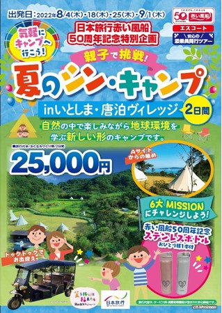株式会社日本旅行(本社:東京都中央区、代表取締役社長:小谷野悦光)は、国内個人旅行商品ブランド「赤い風船」発売50周年特別企画として8月~9月にSDGsを体感できる1泊2日の福岡市内発着のバスツアー「親子で挑戦!夏のシン・キャンプ Inいとしま・唐泊ヴィレッジ1泊2日」を7月8日(金)より販売します。