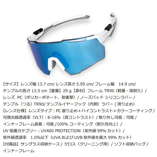 レンズタイプ:PC曇り止め+ハイコントラスト+カラーコーティング/可視光線透過率(VLT):8-18%(高コントラスト)/取り外し可能:可能/インナーフレーム装着:可能/100% コーティング(耐久性向上)/UV保護カテゴリー:UV400 PROTECTION(紫外線99%カット)/紫外線透過率 1.0%以下(UVAおよびUVB紫外線を最大99%カット)