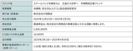 ソニー銀行株式会社(代表取締役社長:南 啓二/本社:東京都千代田区/以下 ソニー銀行)は、2024年12月23日(月)より、投資型クラウドファンディングのプラットフォーム「Sony Bank GATE」において、株式会社片岡商店を営業者として出資募集の取り扱いを開始しますので、お知らせします。なお、広島県内企業として初の Sony Bank GATE ファンド組成となります。