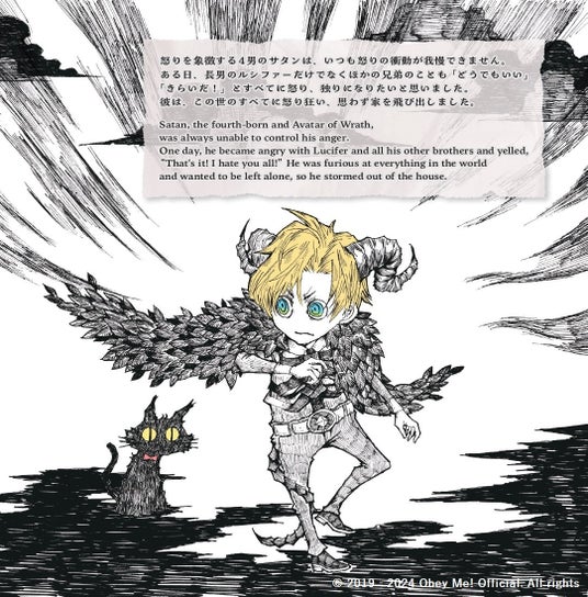 「Obey Me! 絵本 サタンの家出」は、怒りを象徴する4男のサタンが主人公。悪魔の兄弟たちと住んでいた彼でしたが、ある日この世のすべてに怒り狂い、思わず家を飛び出してしまいます。みんなと離れて、大好きなネコと一緒に大好きな本を読む満ち足りた生活をしているはずなのに、何かが足りない気がして……?