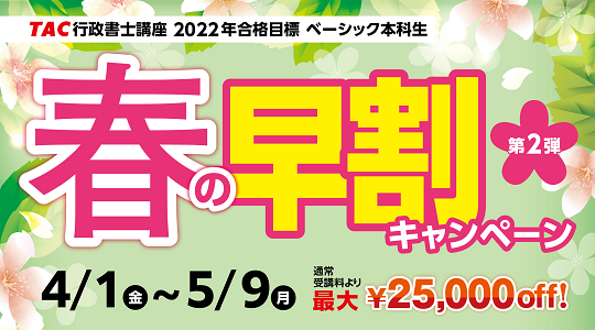 行政書士試験対策講座を展開しているTAC株式会社(東京都千代田区、代表取締役:多田敏男)は、対象コースが通常受講料より最大25,000円割引となる『春の早割キャンペーン第2弾』を5/9(月)まで実施しております。