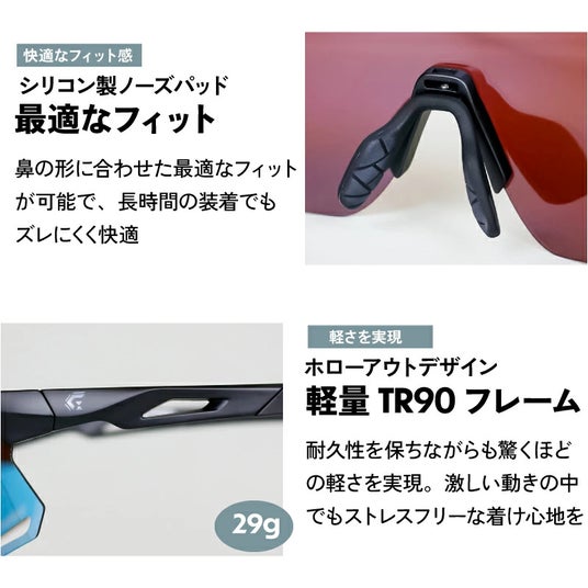 サイクリングやランニング、アウトドアスポーツなど、ハードな環境でも抜群の耐久性を発揮します。 安全性とクリアな視界を兼ね備えたレンズが、あなたのパフォーマンスを全力でサポートします。