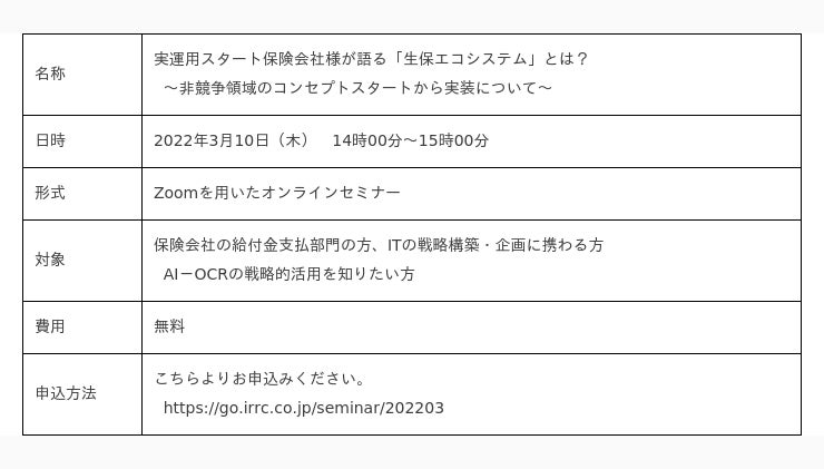 本セミナーでは、「生命保険給付金支払いプラットフォーム」を共同で開発した、チューリッヒ生命・メディケア生命の2社より、コンセプトスタートから実運用しての感想、将来構想までお話しいただきます。保険会社の保険金・給付金支払部門の方、ITの戦略構築・企画に携わる方、AI-OCR の戦略的活用を知りたい方にお勧めです。