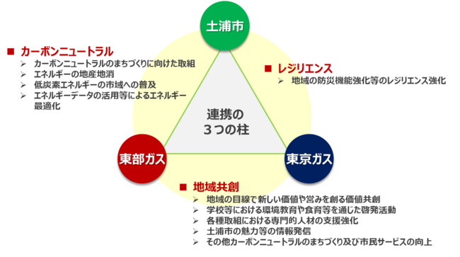 土浦市、東部ガス及び東京ガスは、本協定に基づき、カーボンニュートラルへの取組を含めた様々な分野で連携を強化し、脱炭素社会の実現に貢献してまいります。