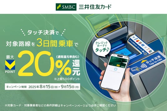 三井住友カード株式会社(本社:東京都江東区、代表取締役 社長執行役員 CEO:大西 幸彦、以下:三井住友カード)は2025年8月15日(金)より対象カード限定で「タッチ決済でお得に乗車!対象路線を3日間ご利用で最大20%還元キャンペーン!」を開始します。