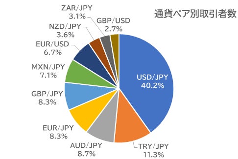 通貨ペア別取引者数のトップ10は、USD/JPY(米ドル/円)・TRY/JPY(トルコリラ/円)・AUD/JPY(豪ドル/円)・EUR/JPY(ユーロ/円)・GBP/JPY(ポンド/円)・MXN/JPY(メキシコペソ/円)・EUR/USD(ユーロ/米ドル)・NZD/JPY(NZドル/円)・ZAR/JPY (南アフリカランド/円)・GBP/USD(ポンド/米ドル)の順。