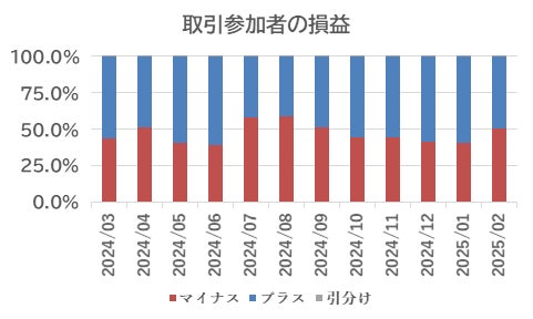 FX取引における実現損益でプラスは49.4%、マイナスは50.5%(残りはプラスマイナスがゼロ)と、1月から大きく悪化した。トランプ米大統領の政策を巡り金融市場の方向性が不鮮明になり、個人投資家も収益を残しづらかった。