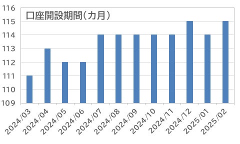 取引をしたFX投資家の口座開設後の期間は、平均115カ月(9年7カ月)と、前月から小幅に拡大。直近では、114カ月程度で横ばいが続いている。