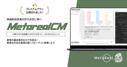 メタリアル・グループの株式会社ロゼッタ(代表取締役:五石 順一)は、劇場の映画配給ニーズ予測レポート AI エージェント「Metareal シネマプリディクト」(以下、Metareal CM)のプレミアムプラン(月額 5 万円(税込)、1日20 回・月200 回利用可能)を 2025 年 12月15日(月)より提供開始しました。