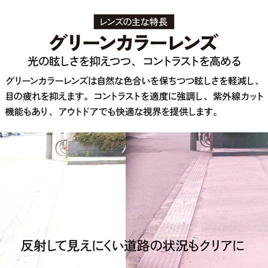 グリーンレンズは視界の歪みが少なく、自然な色合いを保ちつつ眩しさを軽減します。