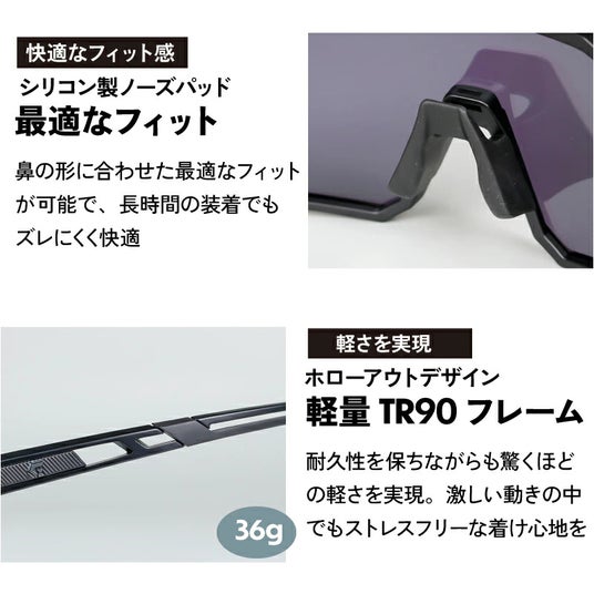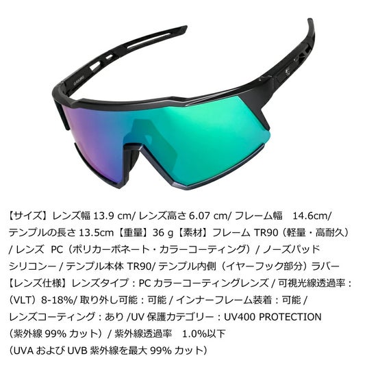 このスポーツサングラスは、耐衝撃性・軽量性に優れたポリカーボネートレンズを採用し、