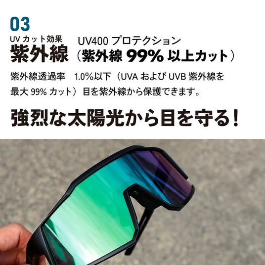 UV400プロテクション機能により紫外線を99%以上カットし、目をしっかり保護します。