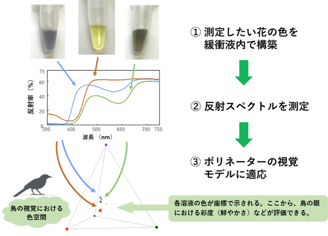翡翠色の花を発色するには、液胞のpHが通常の植物よりも高い必要があることが、これまでの研究で分かっています。液胞のpHが高いと中に含まれるアントシアニンはより青味が強くなり、淡い黄色の発色に関わるフラボノールも色が濃くなります。私たちは、液胞pHを高くすることが、現地のポリネーターの視覚にアピールすることに役立ち、その結果、種として存続できているのではないかと仮説を立てました。これを検証するため、私たちは花色素溶液と視覚モデルを併せた新たな解析手法を開発しました。この手法では、試験管内でそれぞれの花の色素組成を再現し、溶液のpHを変えることで、ポリネーターの視覚にどのように影響するかを評価することができます(図3)。その手法を用いた結果、翡翠色の花の色素組成を持つ溶液では、pHが高くなることで現地のスズメ目の鳥類のような4色型色覚(*3)を持つ鳥類に対して、より鮮やかに映るという結果を得ました。この結果は、自然界においても翡翠色の花が生存には不利にならないことを意味しています。
