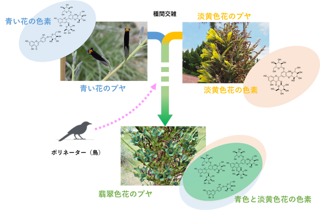 独立行政法人国立科学博物館(館長:篠田 謙一)の水野貴行研究主幹(植物研究部多様性解析・保全グループ)は、慶應義塾大学理工学部、公益財団法人サントリー生命科学財団、大阪公立大学附属植物園とともに、翡翠色の花を咲かせるパイナップル科のヒスイラン(Puya alpestris)とその近縁種の花色素を解析し、翡翠色の花が青い花を持つ種と淡い黄色の花を持つ種の雑種に起源することを示唆しました。また、視覚モデルを取り入れた新たな色素解析から、翡翠色の花が現地のスズメ目の鳥類に鮮やかに見えることが明らかになり、これまで自然界に翡翠色の花がほとんど存在しないのは、鳥たちに見えにくいためであるという仮説は正しくないことが示唆されました。この成果は、Journal of Plant Research(植物学雑誌)で公表されました。