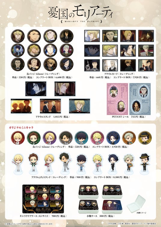 公式イラスト&オリジナルミニキャラを使用して、内容盛りだくさんで登場したTVアニメ『憂国のモリアーティ』の新作グッズ。