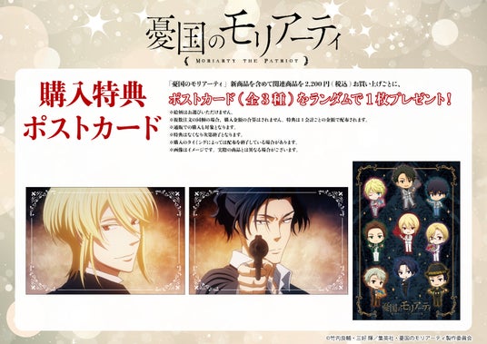 TVアニメ『憂国のモリアーティ』の新作グッズを含む関連商品を2,200円(税込)お買い上げごとに、ポストカード(全3種)をランダムで1枚プレゼント。