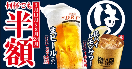 リニューアルOP記念 生ビール&樽ハイレモンサワー半額キャンペーンについて