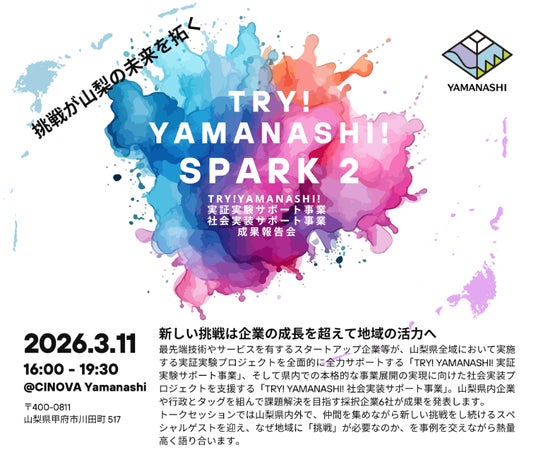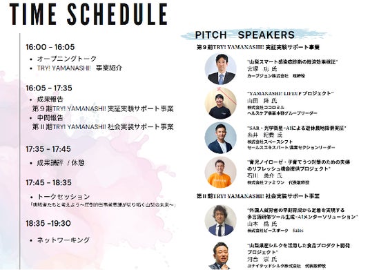 最先端技術やサービスを有するスタートアップ企業等が、山梨県全域において実施する実証実験プロジェクトを全面的に全力サポートする「TRY! YAMANASHI! 実証実験サポート事業」、そして県内での本格的な事業展開の実現に向けた社会実装プロジェクトを支援する「TRY! YAMANASHI! 社会実装サポート事業」として、山梨県内企業や行政とタッグを組んで課題解決を目指す採択企業6社が成果を発表します。