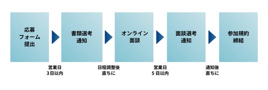 プログラムの支援期間は、1期あたり6ヶ月間です。応募フォームご提出後、書類選考とオンラインでの面談選考を経て、可能な限りスピーディに支援を開始します。