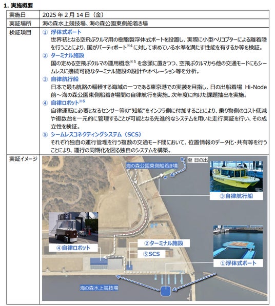 今回の実証実験は、海の森水上競技場へ設置した樹脂製の浮体式ポートへのヘリコプターによる世界初の離着陸実証をはじめ、自律航行小型船舶による東京港初となる運航実証、自律ロボットによる運行実証等や、陸海空それぞれの次世代モビリティをシームレスに接続させるシステム構築を行うことで、これらのモビリティやシステムの社会実装に向けた課題抽出を行うことを目的とするものです。
