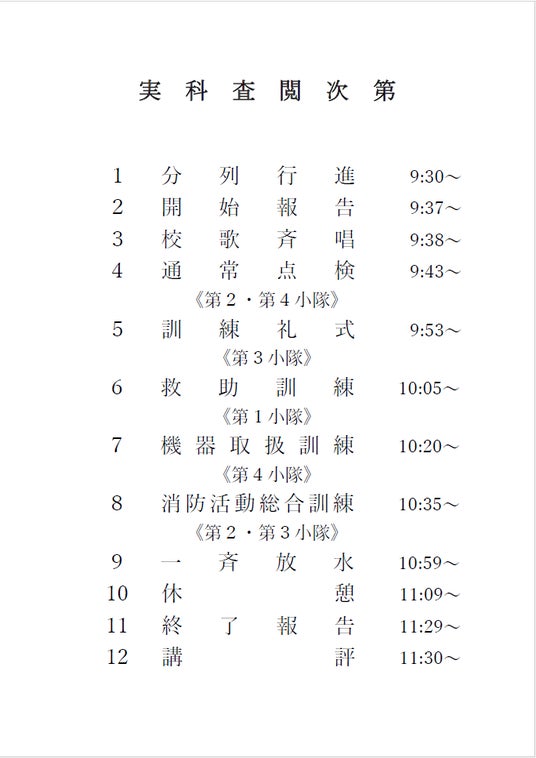 教育訓練の成果として、次のとおり、埼玉県消防学校実科査閲訓練を実施することとし、一般の方向けにも訓練を公開することとしました。