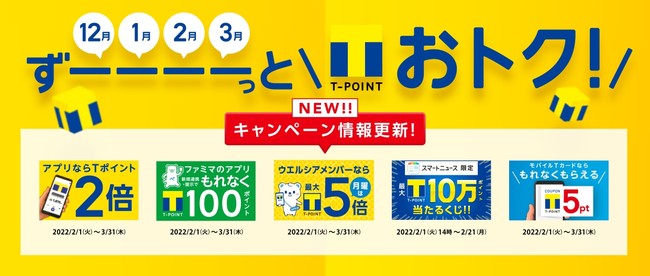 株式会社Tポイント・ジャパン(本社:東京都渋谷区、代表取締役社長:北村和彦)は、「Tポイントがずーーーーっとおトク」なキャンペーンの第2弾として、2022年2月1日(火)より、コンビニやドラッグストアなど全国のモバイルTカード対応店で実施する「アプリならTポイント2倍キャンペーン」をはじめ、「SmartNews(スマートニュース)」限定で毎日当たるくじなど5種類のキャンペーンを開催いたします。