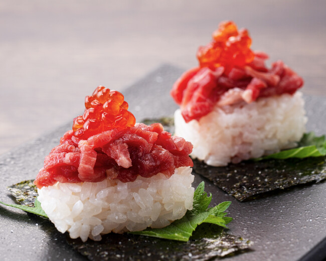 プチプチいくらとユッケの食感が楽しい肉寿司。