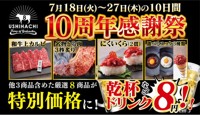 皆さまに支えられ、USHIHACHIは2023年7月をもって10周年を迎えます。10周年の感謝の気持ちを込めて、期間中全12店舗で厳選8商品を特別価格でご提供いたします。
