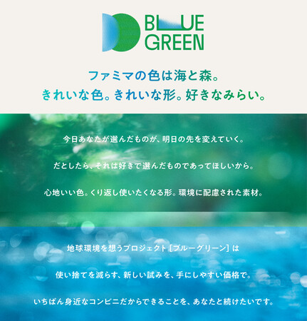 このたび、「地球環境に良いこと、役に立つことを少しずつでもできることから実行していこう。」という思いを込めて、「コンビニエンスウェア」のデザイナーをつとめる落合宏理氏監修のもと、「コンビニエンスウェア ブルーグリーン」プロジェクトを発足いたします。ファミリーマートのコーポレートカラーである青と緑は、地球(海・森)をイメージする色であることから「ブルーグリーン」と命名し、地球環境を想うさまざまな取り組みを実施してまいります。