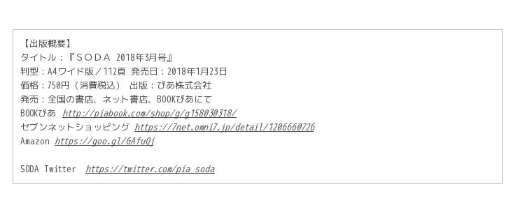 ぴあ株式会社より、『SODA 2018年3月号』が1月23日に発売となりました。