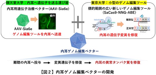 そこで、東京大学の新型ゲノム編集ツール「SaCas9-NNG-ABE」を順天堂大学の内耳用遺伝子治療ベクター「AAV-Sia6e」に搭載して更に改良を進め、新たな遺伝子治療薬、「内耳ゲノム編集ベクター」を開発しました。