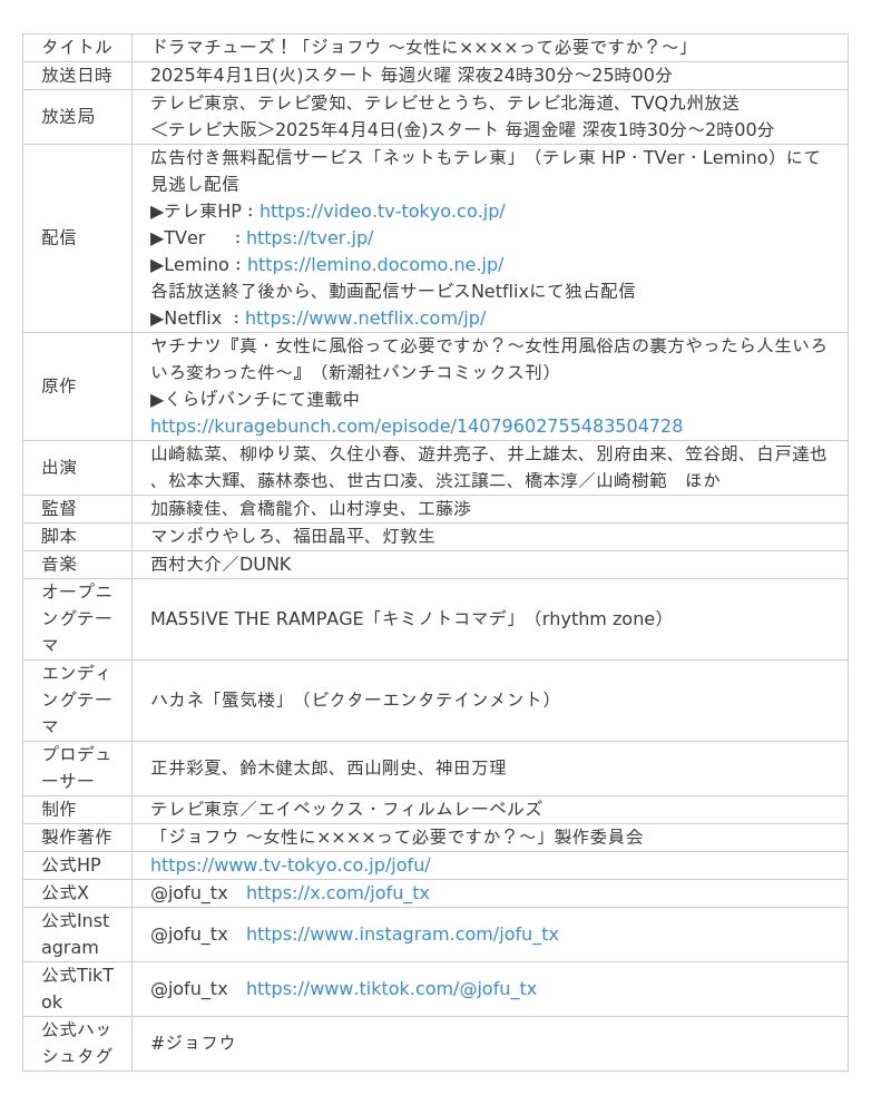 はじめは風俗業界に対し抵抗があったアカリが、女風を利用する女性たちの様々な悩みに触れ、個性豊かなセラピストたちと、一人でも多くの女性の要望にこたえるために奮闘していきます。4月1日(火)深夜よりテレ東ほかにて放送がスタートしています。