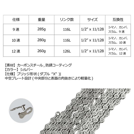 9速/10速/12速対応で、シマノ・カンパニョーロ・スラムに互換性があります。