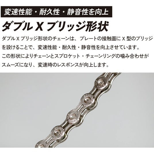 ダブルXブリッジ形状のチェーンは、プレートの接触面にX型のブリッジを設けることで、