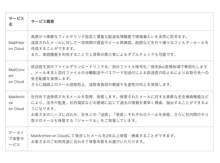 GUARDIANWALL Mailセキュリティ・クラウドのラインナップである、「MailFilter on Cloud」および「MailArchive on Cloud」との組み合わせでメールからの情報漏えい対策強化を実現します。