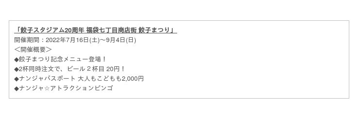 株式会社バンダイナムコアミューズメントが運営する屋内型テーマパーク「NAMJATOWN(ナンジャタウン)」(東京・池袋)は、全国各地のご当地餃子が楽しめる「ナンジャ餃子スタジアム」がこの7月に20周年を迎えることを記念し、「餃子スタジアム20周年 福袋七丁目商店街 餃子まつり」(以下、餃子まつり)を2022年7月16日(土)から9月4日(日)まで開催します。