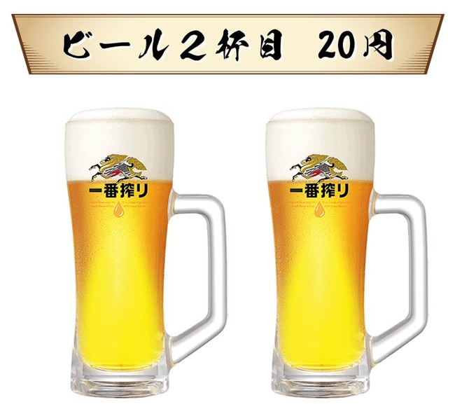 ビール(590円)を2杯同時にご注文いただくと、2杯目がなんと20円に!