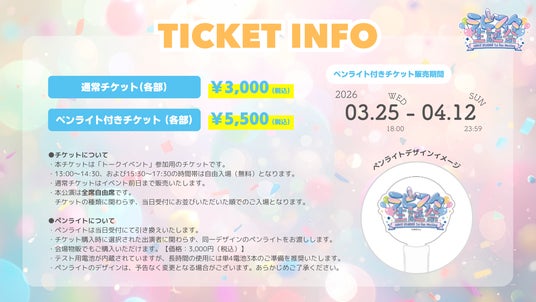 トークイベントのチケットは2026年3月25日(水)18時より販売いたします。通常チケットはイベント前日まで販売しておりますが、ペンライト付きチケットは2026年4月12日(日)23時59分までとなっておりますのでご注意ください。