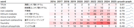 5位の「micro transfer」はIII-V族半導体やニオブ酸リチウムなどの異種材料結晶を、整列した複数チップの状態でまとめてシリコン基板上に転写する製造技術に関するキーワードです。同様の製造技術は半導体以外の領域においても、微小なLEDチップをならべて大画面ディスプレイを形成するマイクロLEDディスプレイでの活用が検討されており、技術の相互転用による進展が期待されます。