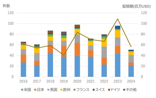 米国、日本、英国の3国が件数の7割以上をつねに占めており、国家としての継続的な注力が見てとれます。件数の年次推移には大きな変動はみられませんが、いわゆるGAFAM企業の生成AIへの本格参入がはじまった2023年に、配賦総額の増加を確認できます。