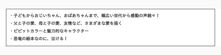 強くてかっこいいだけじゃない恐竜たちの物語には、大人だけでなく子どもも感情を揺さぶられるようで、「子どもが初めて感動の涙を流したのがこの本でした」など、心の成長を喜ぶ声が、日々寄せられています。