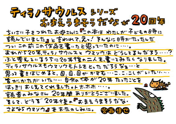 『おまえ うまそうだな』からはじまる宮西達也・ティラノサウルスシリーズが今年で20周年を迎えました。12月20日発売の『おまえうまそうだな さよならウマソウ』は、1巻目で切ない別れをした恐竜の親子が再会する物語です。