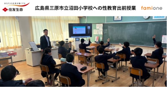 「子どもを願うすべての人によりそい 幸せな人生を歩める社会をつくる」をビジョンに掲げ、法人の従業員向け福利厚生や自治体の住民向け支援を行うヘルスケアサポートサービス「ファミワン」 https://famione.com/benefit/ などを展開する株式会社ファミワン(本社:東京都渋谷区、代表取締役:石川勇介)は、2026年2月に住友生命保険相互会社(本社:大阪府大阪市、取締役 代表執行役社長:高田 幸徳)との協業に関するプロジェクトの一環として、性教育に関する出前授業を、広島県の三原市立沼田小学校でオンライン開催しました。