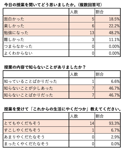 出前授業に参加した児童の事後アンケート※では、回答者全員が授業を受けてこれからの生活に「役立ちそう」と回答しました。