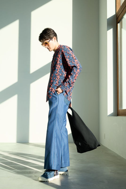 そんなオーバーラボを春の装いにコーディネート。足元は新色のインディゴ。開襟シャツにストライプパンツをカジュアルダウンして、パターン×パターンの“オトナ”アバンギャルドスタイルに。