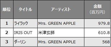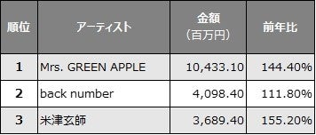 デジタルシングル(単曲)、デジタルアルバム、ストリーミングを合算した年間デジタル総売上金額では、Mrs. GREEN APPLEが100億円超えを記録し、2年連続で1位を獲得しました。デジタル売上が100億円を超えるのはオリコン史上初となります。