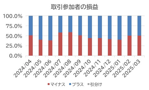 FX取引における実現損益でプラスは49.2%(2月は49.4%)、マイナスは50.7%(2月は50.5%)と、前月から収益を確保できた投資家は減少した。トランプ米大統領の関税策を巡り米インフレ上昇や成長鈍化など金融・経済の行方が不鮮明になったため、個人投資家は収益を残しづらかった。
