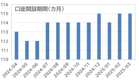 取引をしたFX投資家の口座開設後の期間は、平均115カ月(9年7カ月)と、前月から横ばい。114カ月程度での推移が続いている。