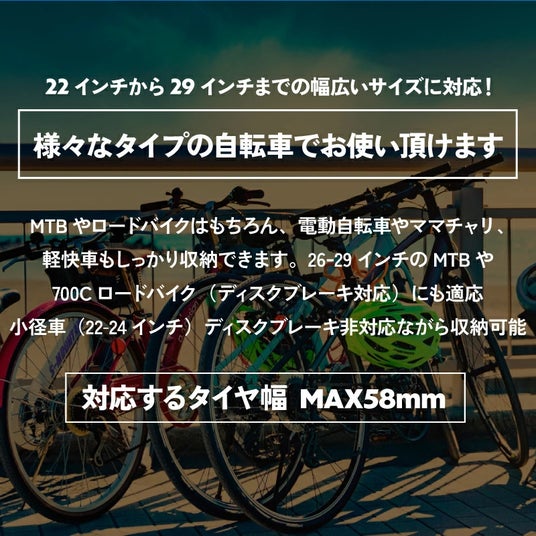 22~24インチ(ディスクブレーキ非対応)/26~29インチMTB・700Cロードバイク(ディスクブレーキ対応) /ハンドル幅700mm以下、自転車重量30kg以下