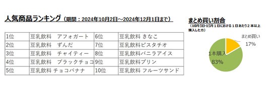 王道の「無調整」「調製」豆乳や、フレーバー付きの「バナナ」、「紅茶」等の市場の人気商品を差し置き、「アフォガート」、「ずんだ」といった意外なフレーバーが好調でした。まとめ買い需要も高く全体の約17%が2本以上のまとめ買い※であり、中には一度に20本を超える商品を購入いただいたお客さまもいらっしゃいました。商品の品揃えの豊富さにより、市場では珍しく手に取ることが少ない商品にスポットがあたったことが、新たな需要を獲得した一つの要因として考えられます。 ※ウォータービジネスカンパニー購買動向データから推定